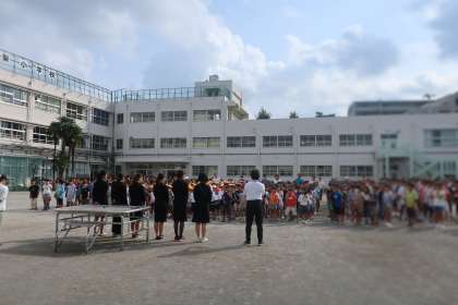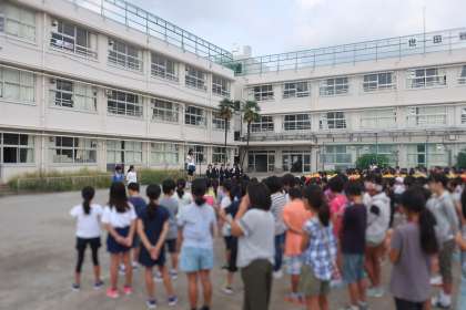 全校に、ボランティア実習で今週お世話になる大学生の紹介がありました。