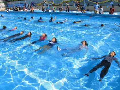 水難事故の場合,体力の消耗と日焼けを防ぎ,保温効果と浮力を得るため,基本的には,着衣のまま,平浮きで救助を待つことになります。授業では,平浮きの練習に加え,救助を待つ場合を想定して,ペットボトルやビニル袋,空気を閉じ込めた衣類をお腹に抱え,浮き輪代わりにして浮く体験もしました。