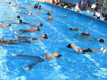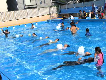 9月10日,水泳学習の最終日に,6年生は着衣泳を行いました。子供たちは,水中でまとわりつく,重い衣類に悪戦苦闘。