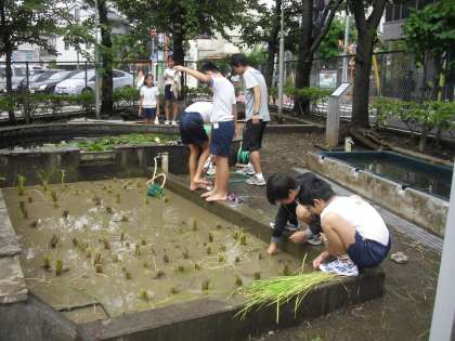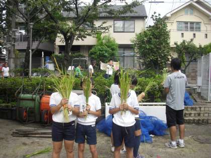 1,2時間目に5年生が稲刈りをしました。田植えが遅れたせいもありいくらか実の付きは悪いのですが稲の育ちの学習は十分にできました。これから乾燥させて脱穀・精米まで行うそうです。5年生は4日から川場にでかけますが、本場の米作りにふれてきて欲しいです。