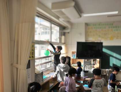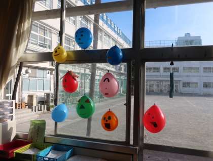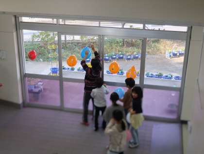 完成したわくわくの顔を、教室や廊下の窓ガラスにはります。
