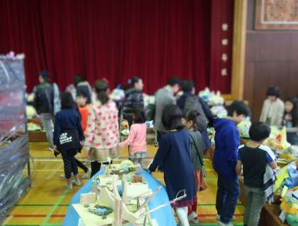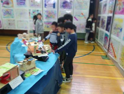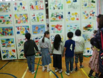 2年生と4年生が手をつないで一緒に作品を見ました。