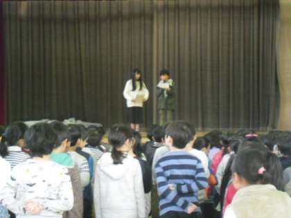 校庭の状態が悪く、朝会は体育館で行いました。代表委員会の児童が募金のお願いをしました。