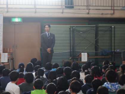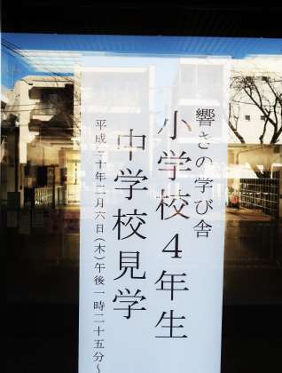 「響きの学び舎」の3つの小学校の4年生が集まって、駒留中学校の見学をさせていただきました。