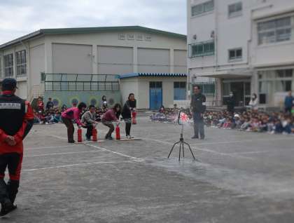 避難後、消火器による消火訓練と通報訓練を行いました。