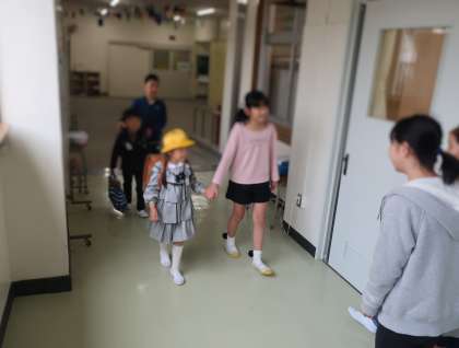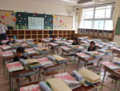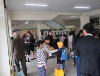 受付のところで、6年生のお兄さん・お姉さんが名札を1年生に付け、教室まで連れて行ってくれます。入学式が始まるまで、自分の席で静かに待っています。