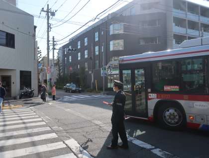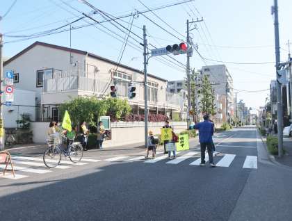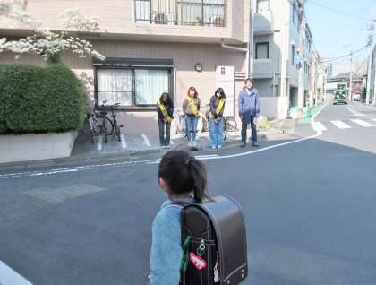 地域の方が横断歩道に立って、子どもたちの安全を見守ってくださっています。
