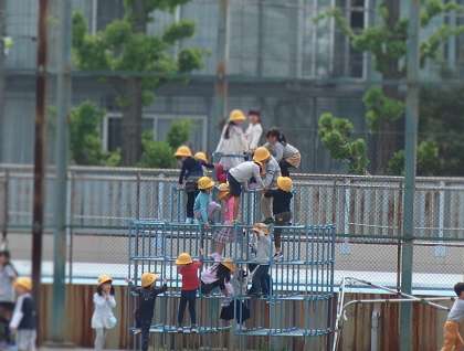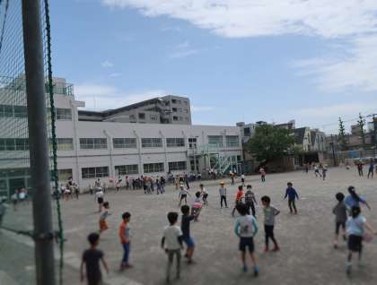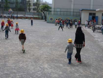黄色い帽子をかぶった1年生の、中休み校庭デビューです。
