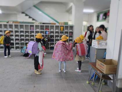 1年生にとっては、大きなランドセルを背負って、傘の始末をすることはなかなか大変です。優しい6年生が、そっと手伝ってくれます。