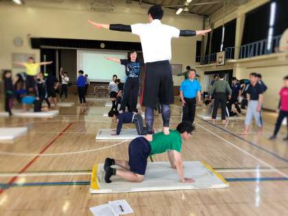 組体操を指導するときの留意点や補助の仕方、演技するときの子供にかかる重みや負担など学びました。