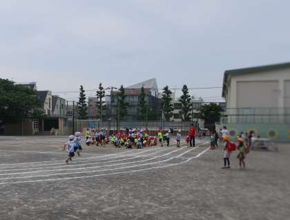 低学年の紅白リレーの朝練をしています。
