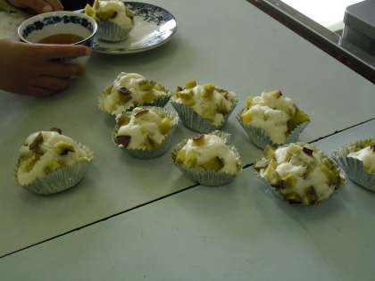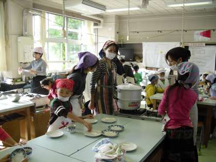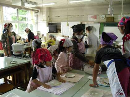 先日の芋ほり遠足で収穫したサツマイモを材料にして、1年生が蒸しパンづくりを保護者の方としていました。ふかしたてのパンはとても良い香りがしていました。
