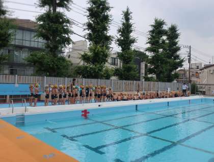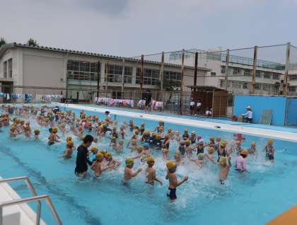 プールでの約束やプールの入り方など、一つ一つ確認していきます。