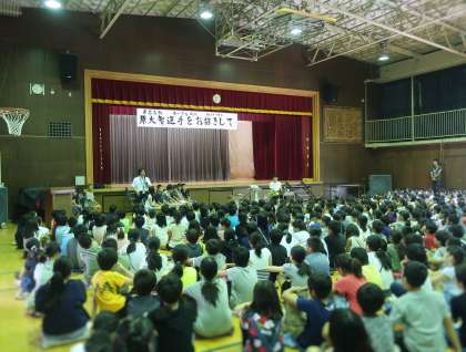 体育館では、全校児童が集まり、質問をしたり、お話を聞いたりしました。