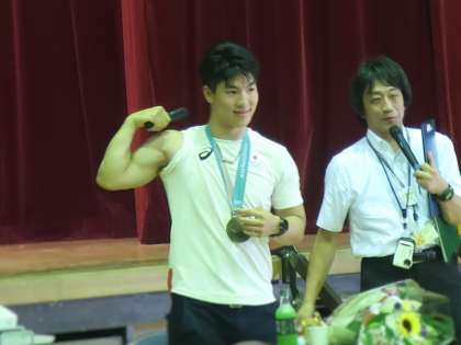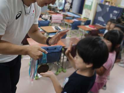 その後、各クラスを回ってくださり、一緒に写真を撮ったり、銅メダルを見せていただいたりしました。