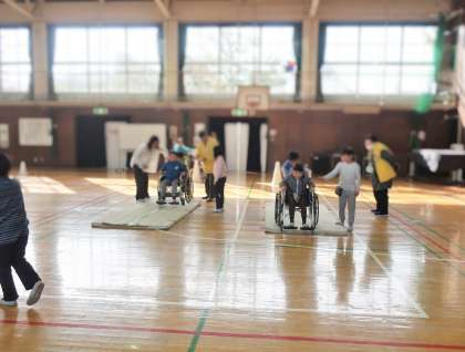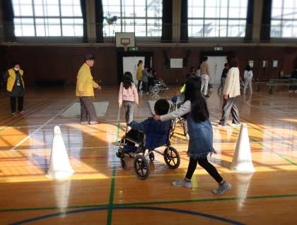 体育館で実際に車椅子に乗ったり、押したりしてみました。