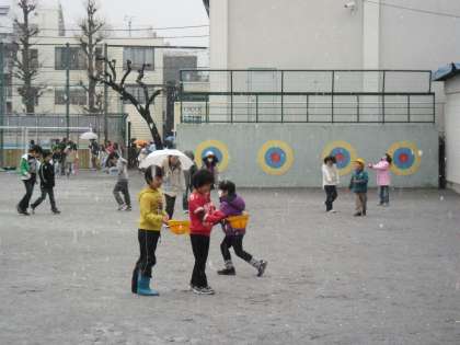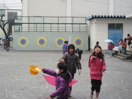 今朝の8時過ぎ校庭から急に子どもたちの歓声があがりました。何事かと校庭を見ますと大粒の雪が降っていました。子どもたちは空を見上げたり雪をキャッチしたり、つかの間の雪でしたが大喜びでした。