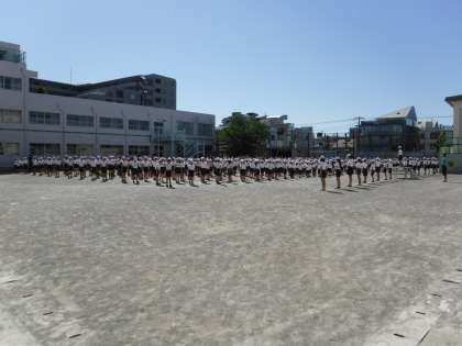 5月の体育集会のテーマは5月25日の運動会を見据えて、集団行動。ラジオ体操や行進などを行いました。体育委員会の児童が、「気を付け、休め」などの整頓の仕方や「足踏みからの止まれ、そして行進の仕方」、「ラジオ体操」の見本を全校児童に示し、それを見習って全校で取り組みました。
