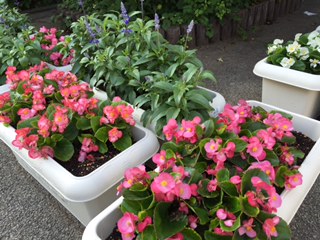 オリンピックパラリンピックの取組の一環として、世田谷で育てたベゴニアとブルーサルビアを児童がプランターに植えました。正門昇降口を彩っています。