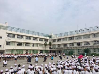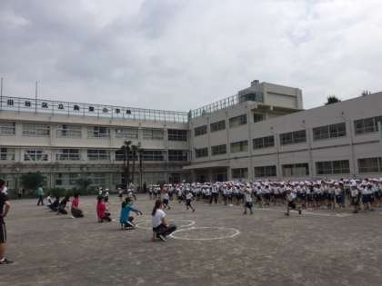 体育委員会の児童が司会となり、全校で「なわとびメドレーリレー」を行いました。スタートラインから短なわを持って走り、円内で前跳びを3回して、次の人にタッチしていきます。