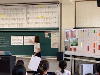 音楽4年生の研究授業が行われ、都内の先生方も参観にご来校いただきました。「もみじ」の主旋律と副次的な旋律を合わせて歌うことができるように児童が様々工夫を考え歌いました