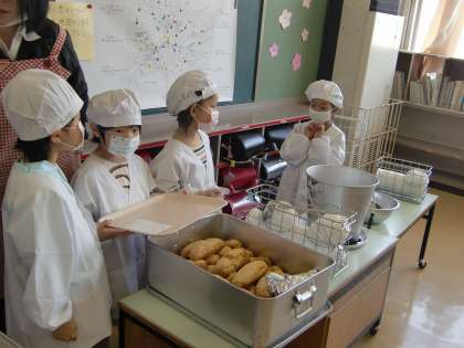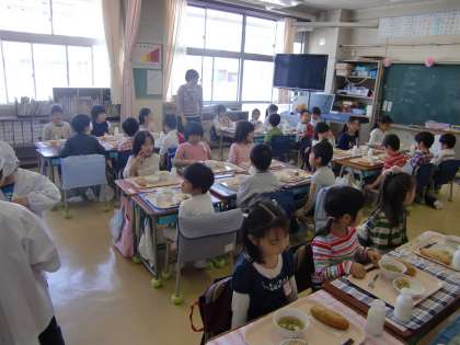 給食が初めての子もいました。給食当番も自分たちで一生懸命がんばっています。