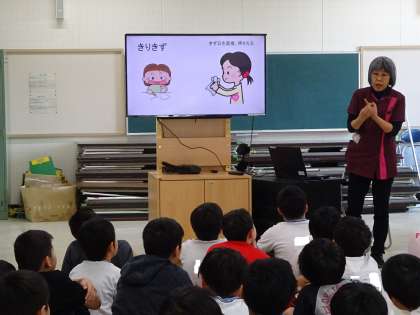 5年生 保健指導「けがの手当て」を行いました。自分がけがをした時の手当ての仕方や大きなけがをしている人がいるときの対応の仕方を学びました。