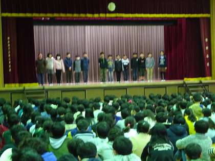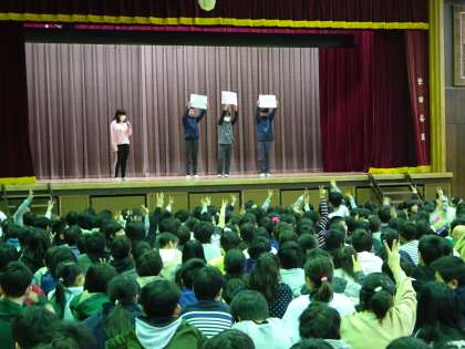 5,6年の集会委員会のみなさんが、お笑い芸人などの物まねをして、だれの物まねをしたか当てるゲームを考えてくれました。全校で楽しく過ごしました。