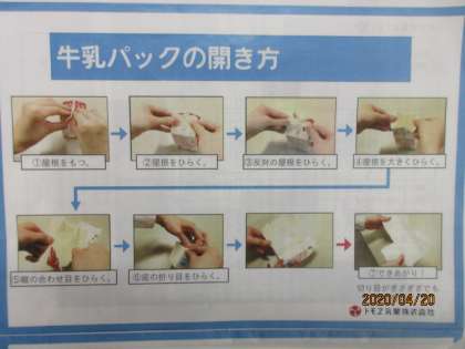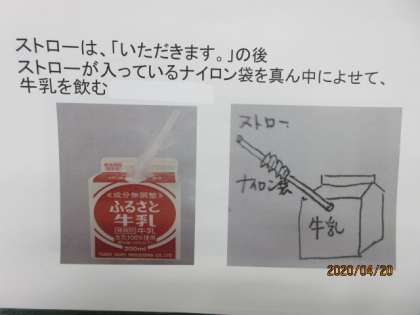 今度から、学校の給食に出る牛乳が、牛乳パックになります。牛乳パックで牛乳を飲むときは、ストローの袋を真ん中に寄せて飲みます。片付けるときは、自分で牛乳パックを開いて片付けます。自分で開けられるように、おうちの人と一緒に練習をしてみましょう。