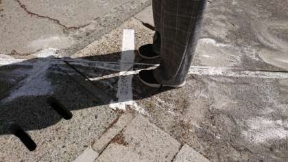 まず、学校に来たら、どちらの門から入っても校庭に行って下さい。校庭に行くと、それぞれの昇降口(くつばこ)のところに、コーンが立っていてラインが引いてあります。前の人と1.5メートル離れて並ぶようになっていますので、ラインに合わせて並んで下さい。(写真1枚目と2枚目)