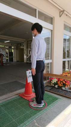 昇降口のところまで近づくと、1つ目のケンステップのところで、手の消毒をするようになっています。そして、2つ目のケンステップのところで、担任の先生と会います。(写真3枚目)
