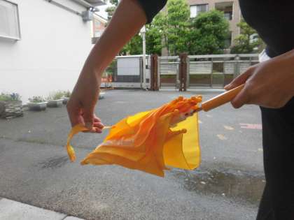 このとき、もう かたほうの てで、かさの ベルトを、もっておきます。