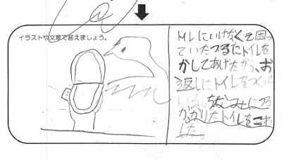 これはトイレに行けなくて困っていたつるにトイレを貸してあげたときのおんがえしですね。つるもトイレに困るんですね。そして、衝撃的なのは借りたトイレをつるがこわしてしまったそうです。なので、新しいトイレを作成中だとか。つる、どんなトイレの仕方をしたの・・・