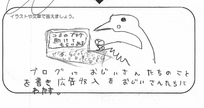 これはつるがブログを書いていて、その広告収入でお金をかせいでおじいさんたちにお金を渡すというおんがえしですね。記事には「助けてもらいました。」と書かれています。個人的に、つるのブログがあったら毎日チェックしますね。もしツイッターとかやってたら「エサゲットなう」みたいなことつぶやくのでしょうか。