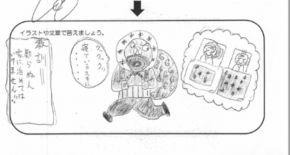 これはつるがおんがえししているのかと思いきや、そもそもつるではなかったというクセ強めのおんがえしですね。これはつるが実はどろぼうでおじいさんとおばあさんが寝ているスキに盗みをはたらき、おんをあだでかえす「あだがえし」ですね。つる、ひどいですね。見てください、このイラスト。もう全くつるではないです。かげも形もないです。そこで教訓「知らぬ人 家に泊めては いけません」すてきな俳句ですね。おじいさんとおばあさんの心からの思いなのでしょう。