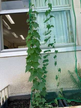 先週みんなで植えたヘチマですが、成長の様子はどうですか?さっそく芽が出てきた人もいるようです。ちなみに4年生のヘチマは、気がついたら、こんなに大きくなっています!みなさんもたくさん水をあげて、どんどん大きくなるといいですね!