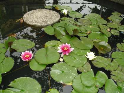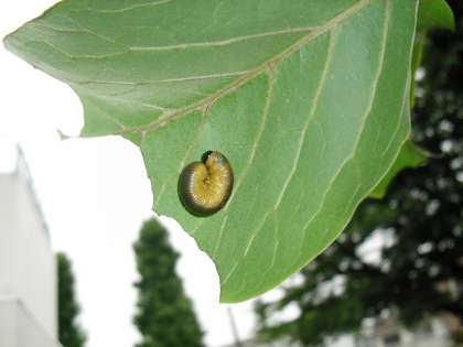 池のスイレンがきれいに咲きました。そばにあるモクレンの木の葉をみると虫にかじられた跡がありました。地面には糞もたくさん落ちていました。虫を捜すと葉の裏側に隠れていました。たぶん昼寝をしているのでしょう。どうやら葉をかじるのは夜のようです。