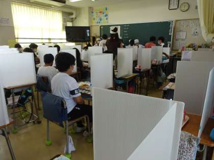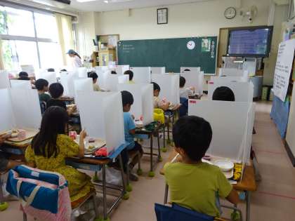 新型コロナウイルス感染症予防のために、マスクを外す給食時間は、各自がパーティションを机に置いて、おしゃべりをしないで食べます。