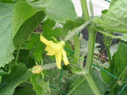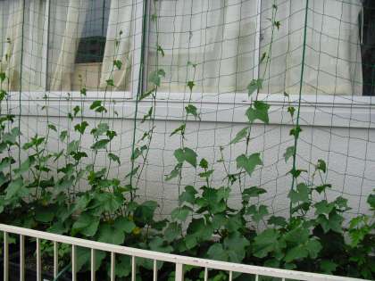キュウリやヘチマの背丈がここでぐんと伸びてきました。しかし、3階まではまだまだです。よく見るとキュウリの赤ちゃんがいくつも見られました。