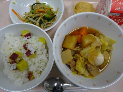 本日の献立 さつまいもごはん 牛乳 豚肉と大根のうま煮 野菜のおかかかけ