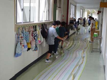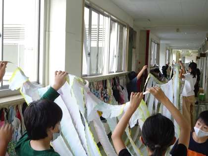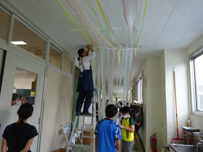 校内の子どもたちの様子を見て歩いていると、学校の雰囲気をガラッとかえる天井のかざりをつくっている4年生に出会いました。他の学年も駒繋小学校への思いを込めて様々なかざりをつくっています。