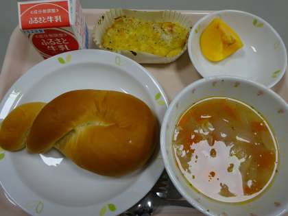 本日の献立 ミルクパン 牛乳 ポテトクリーム焼き 野菜スープ 柿