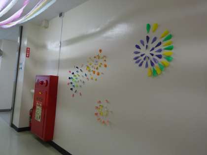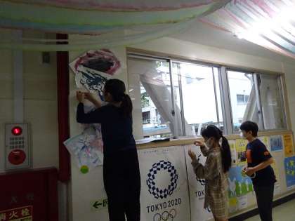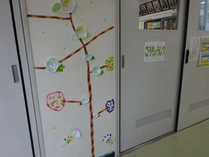 図工の時間に、学校の80歳をお祝いして、みんなでアイディアを出し合い、協力して、その場を通った人が、「わあっ!」とほほ笑んでしまう素敵な装飾をつくっています。5年生も、廊下の壁のちょっとしたひびを隠すかのように、飾り付けてくれています。