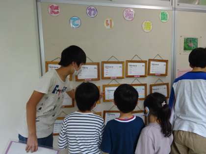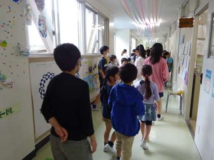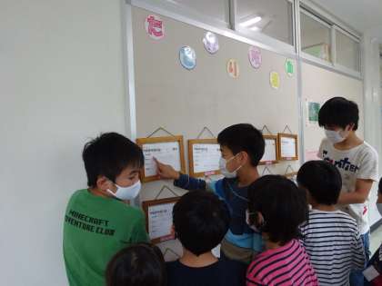 職員室前の掲示板には、「いつ、どこで、なにを」するか掲示されています。その場所への案内や説明のあとは、1年生と遊ぶ6年生の姿が見られました。頼もしい最高学年です。