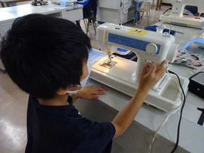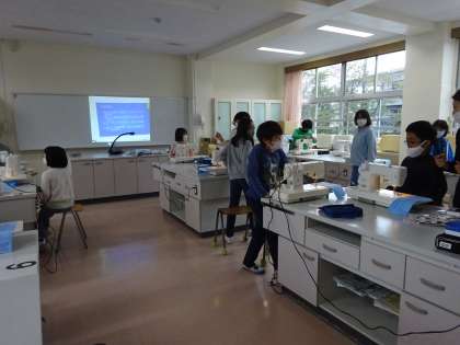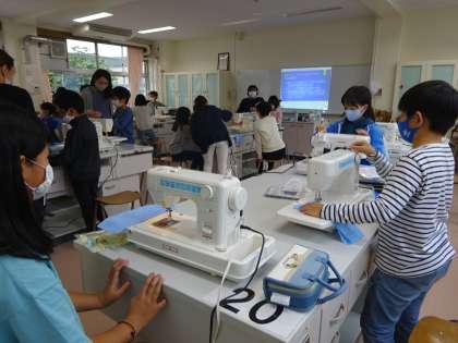 密にならないように、前半と後半に分かれ、保護者の方にお手伝いしていただきながら、ミシンを使いました。初めてのミシンにどきどきの5年生でした。