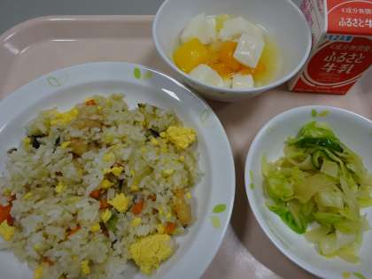 本日の献立 えびチャーハン 牛乳 中華サラダ 杏仁豆腐