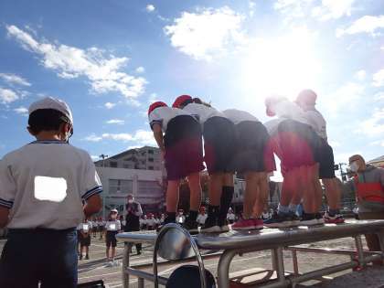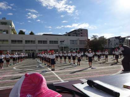 開会式は全校児童が集まることができないので、校庭で1,2年生が、3年生以上は放送を聞くことで行いました。きちんと整列している1,2年生、しっかり教室で聞いている3年生以上の子どもたちでした。今日の日を楽しみにしていた子どもたちの意欲が伝わってきました。