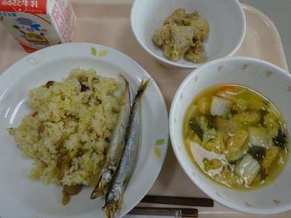 本日の献立 秋の香りごはん 牛乳 焼きししゃも 里芋のそぼろ煮 みそ汁