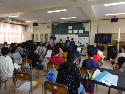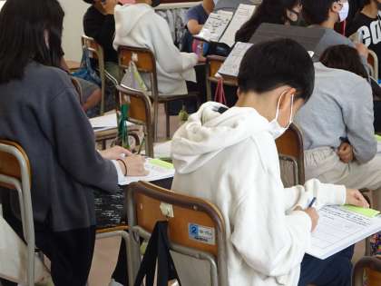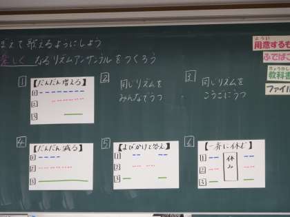 グループごとに相談し、楽しくなるリズムアンサンブルを作りました。今日はその発表。聴いた後は、そのグループの作ったリズムアンサンブルの良さについて各自が記録しました。