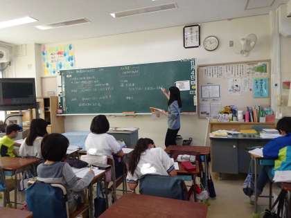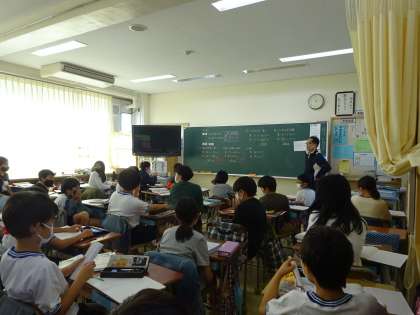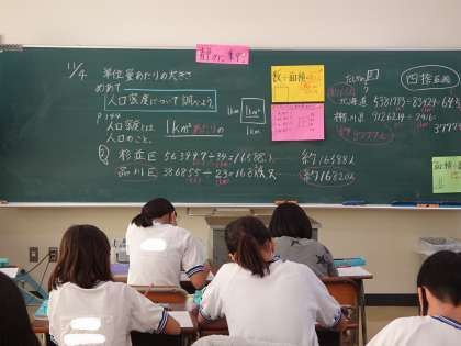算数では「単位量当たりの大きさ」の学習を進めています。今日は、人口密度について学習しました。毎年、この学習を苦手とする子どもが多くみられるので、丁寧に学習を積み上げています。